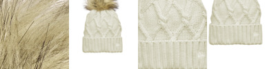 Totally on-trend, this women's beanie has a thick ribbed cuff and a cable knit crown that's topped off by a fun faux fur pom. 100% acrylic Tonal embroidered New Era flag