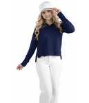* Ventura Suede Knit 6.34-ounce * Solids, 89% recycled polyester/11% spandex * Heathers, 45% recycled polyester/44% polyester/11% spandex * Wicks moisture * Ladies' fit * Tag-free label * Quarter zip pullover with covered placket zipper * Dropped shoulder sleeves for mobility and comfort * Modest cropped length with drop tail * Side vents
